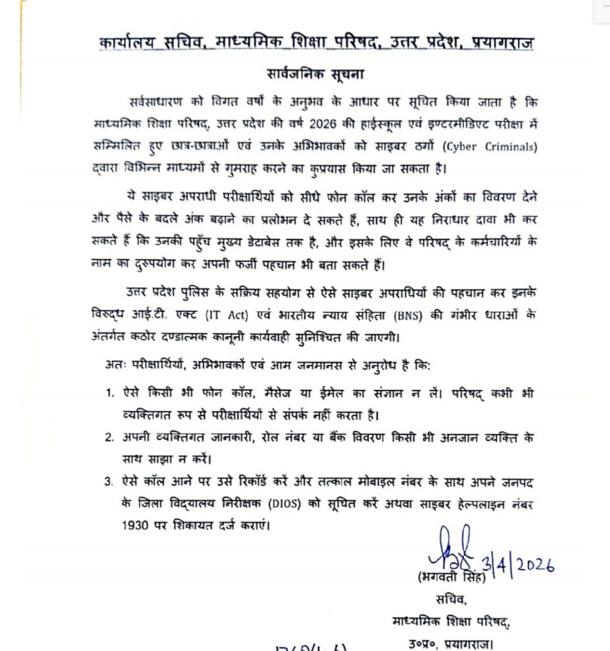 बोर्ड ने यह भी बताया है कि साइबर अपराधी कई बार अपनी पहचान छिपाने के लिए परिषद के कर्मचारियों या अधिकारियों का नाम इस्तेमाल करते हैं। वे खुद को अधिकारी बताकर छात्रों और अभिभावकों को भ्रमित करते हैं, जिससे लोग उनकी बातों पर विश्वास कर लेते हैं। इसी का फायदा उठाकर वे पैसे ऐंठने की कोशिश करते हैं। इसलिए किसी भी अनजान कॉल या मैसेज पर भरोसा करना खतरनाक हो सकता है और इससे आर्थिक नुकसान हो सकता है।